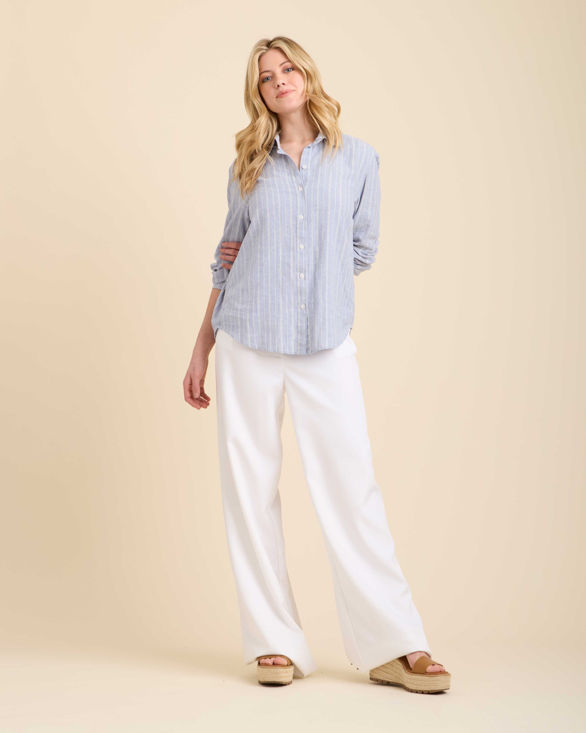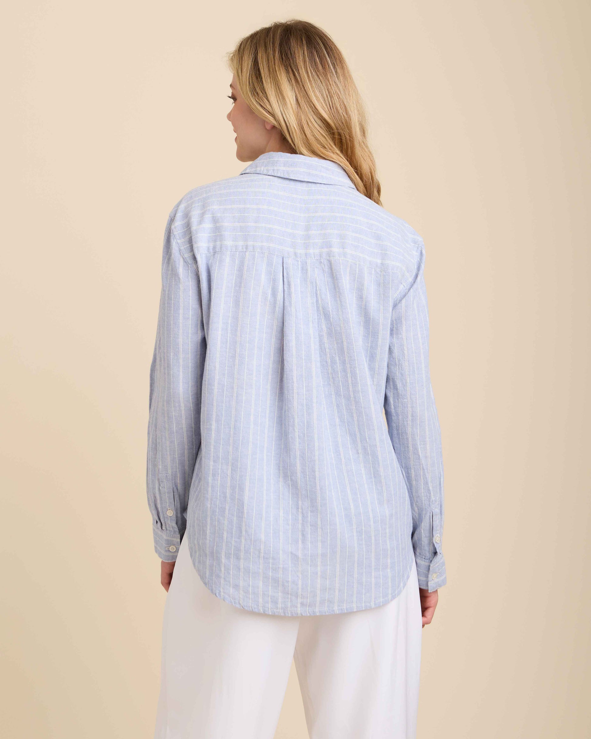 Relaxed, timeless, and transitional, what’s not to love? Our Khalida Striped Blue is the easygoing sister of the Khalida Solid White. Pair with linen shorts for a day in town or layered at the beach basking in the sunshine. Designed with maturity and versatility in mind, the Khalida is your new closet staple.